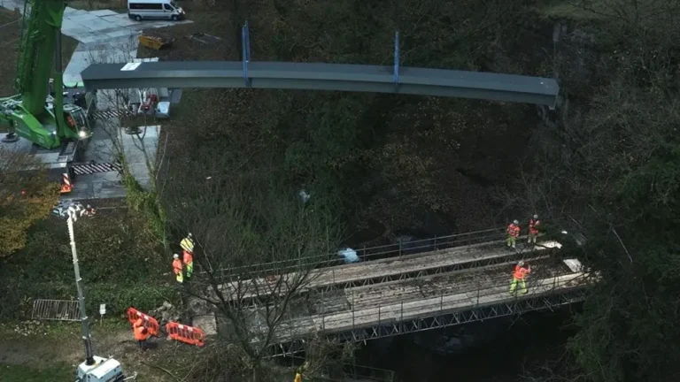 Due to its hard-to-access location and the fact that the bridge was one single span delivered on a long lorry, the journey down the winding Peak District roads had to be carefully navigated, before a huge crane lifted the bridge into place.