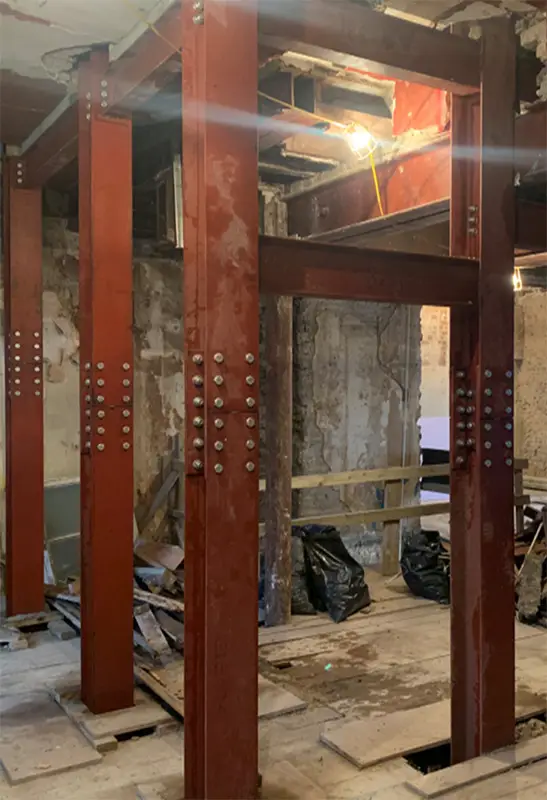 The removal of the main wall required the installation of some major steel beams and columns to transfer the existing loads down to the original foundations. By using the load path of the existing structure, we avoided the installation of new foundations.